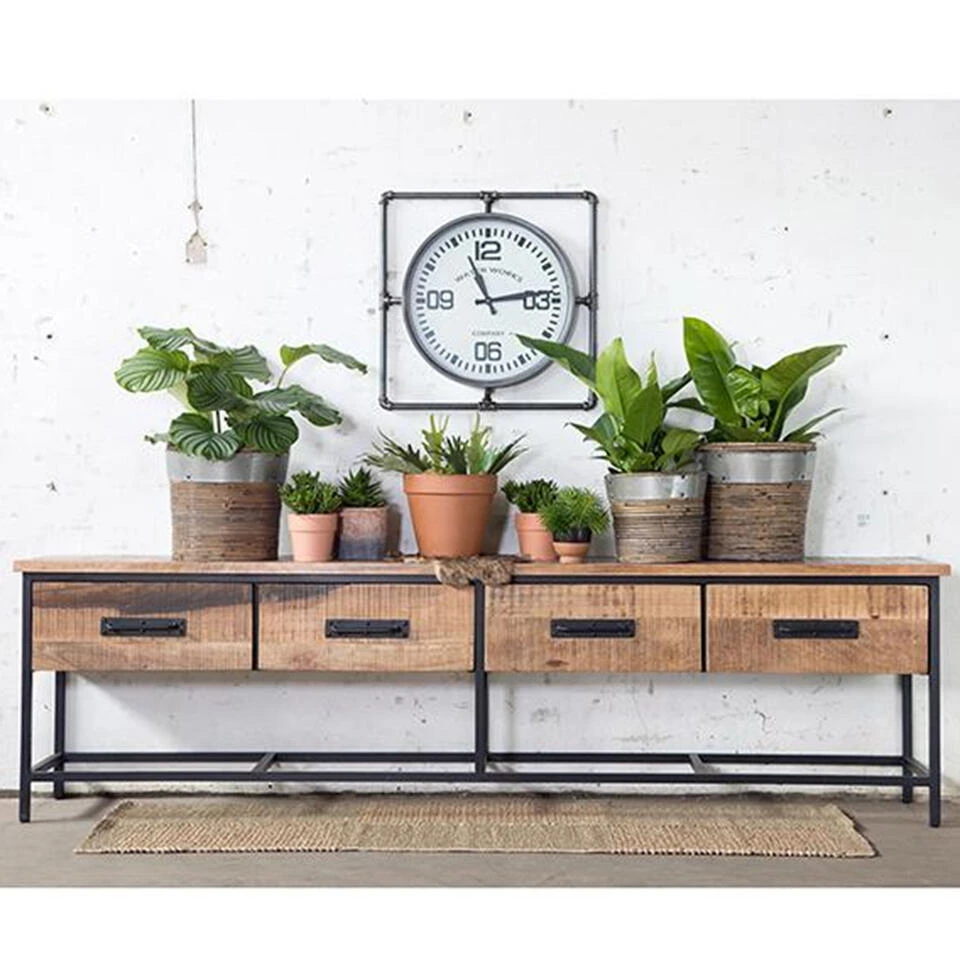 Dit gave tv-meubel is maar liefst 250cm lang! Genoeg ruimte dus voor je tv Ên ook nog eens om hem leuk af te stijlen met leuke accessoires! Dit tv-meubel bevat geen gat aan de achterkant. Het meubel is 250cm breed, 43cm diep en 70cm hoog. De lades zijn 32cm diep en 53cm breed. De kast is gemaakt van hout en metaal.