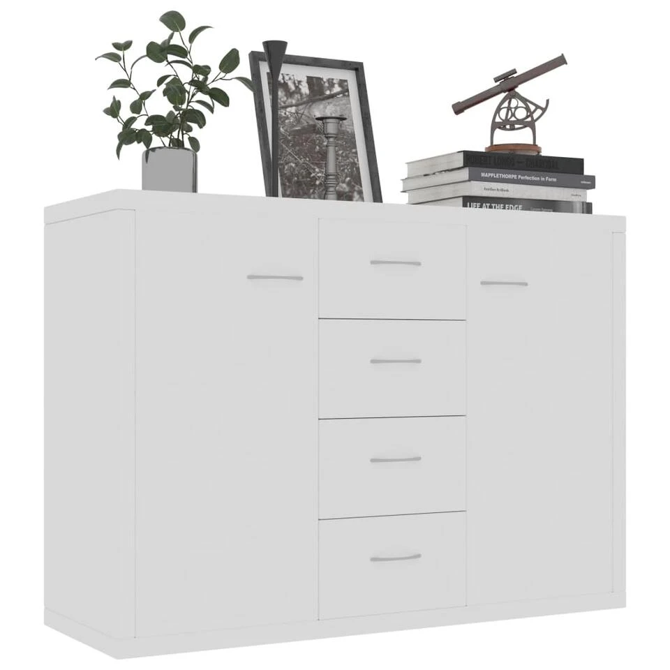 Dit dressoir heeft 4 lades en 2 deuren en biedt voldoende opbergruimte voor boeken, multimedia-apparaten en andere spullen. Het stevige blad is ideaal voor het plaatsen van decoratieve objecten, fotolijsten en potplanten. Het kan ook worden gebruikt als een wandmeubel, bijzetkast, enz. Dankzij het hoogwaardige spaanplaat is dit dressoir zeer duurzaam.