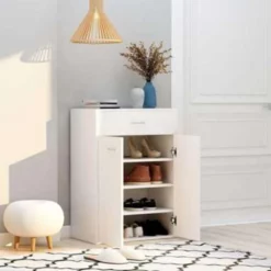 Dit rek is gemaakt van hoogwaardig bewerkt hout dat duurzaam en stevig is. Het heeft een eenvoudig ontwerp waardoor het in elk interieur past. Dit rek heeft 1 lade, 2 deuren en 4 binnenschappen waardoor het ruimte biedt aan sleutels, schoenen, opbergboxen en decoratieve spullen zoals vazen.