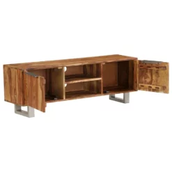Dit houten meubel is gemaakt van massief sheeshamhout en kan ook worden gebruikt als dressoir of hifi-meubel. Sheesham is een tropisch hardhout dat bekend is om zijn rijke nerven en ook wel bekend staat als rozenhout of palissander. Elke stap van het proces wordt met de grootste zorg uitgevoerd, of het nu gaat om polijsten of lakken. Het vakmanschap en de mooie houtnerven maken elk meubel uniek en enigszins anders dan de rest. Deze kast heeft een stevig blad waarop je decoratieve spullen, zoals fruitmanden en vazen, kunt plaatsen. Dit dressoir is ontworpen met 2 vakken en 2 kastjes, waardoor het voldoende ruimte heeft voor je dvd’s, multimedia-apparaten en andere kleine spullen die je binnen handbereik wilt houden. Het meubel heeft 2 gaten aan de achterkant voor kabels. De stalen poten dragen bij aan de stevigheid en aan de moderne stijl uit het midden van de vorige eeuw. Montage is eenvoudig.