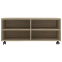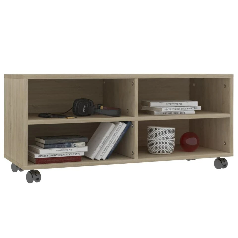 De tv-kast is gemaakt van spaanplaat waardoor hij stevig en duurzaam is. Deze kast is ontworpen met 4 open vakken en biedt voldoende opbergruimte om tijdschriften, boeken, dvd-spelers, ontvangers, mediadragers en multimedia-apparaten overzichtelijk en binnen handbereik te houden. Bovendien kan hij gemakkelijk verplaats worden dankzij de 4 soepel rollende wielen en stevig op zijn plaats blijven dankzij de 2 vergrendelbare wielen.
