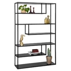 Woood boekenkast Teun heeft een eigentijdse en industriële look. De vakverdeling is anders dan anders en dat geeft deze kast een speels karakter. De kast is geheel zwart van kleur en gemaakt van metaal. Helemaal van nu. Zet er boeken en leuke woonaccessoires in en geef je (woon)kamer een bijzondere look. Maximaal draaggewicht van de legplanken: 30 kg.