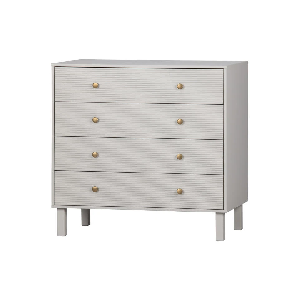 Madu is een stijlvolle, moderne ladekast uit de collectie van het Nederlandse merk WOOOD. Madu is vervaardigd uit grenenhout met een wolkengrijze afwerking. Dit geeft de kast een tijdloze uitstraling. De goudkleurige knoppen in combinatie met het lichtgekleurde grenenhout geven de kast tevens een moderne en stoer karakter.